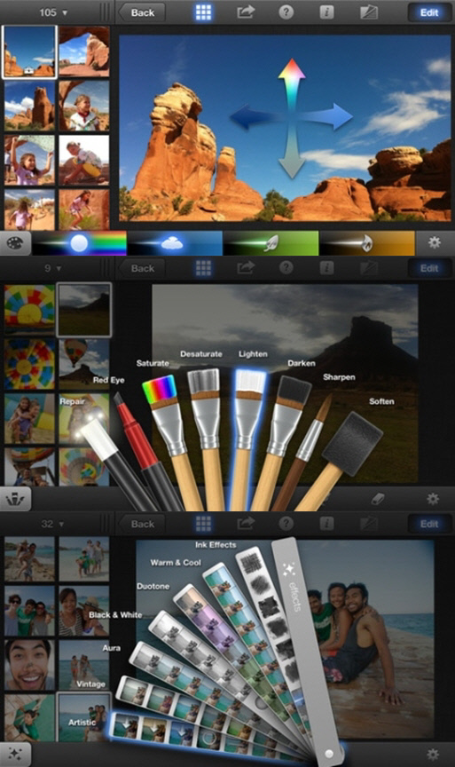 애플 아이포토(iPhoto·4.99달러) 앱을 이용하면 어려운 포토샵 작업 없이 노출조정, 이미지컷, 회전, 리터치 등 기본적인 편집 작업이 가능하다. 또 멕스쳐(Mextures·1.99달러)앱은 70여개의 필터 효과를 중복으로 입히는 '블렌딩' 효과를 줄 수 있다는 장점이 있다. 모멘시아(Momentsia·무료)는 촬영한 사진을 마치 몬드리안의 작품처럼 만들 수 있다. 또 무미건조한 사진에 포인트를 줄 수 있는 독특한 사진 보정 앱 리픽스-리믹스&페인트 포토(Repix-Remix & Paint Photos·무료)이 있다. 여러 가지 효과를 내는 브러시 중 본인이 원하는 것을 선택한 후 직접 손가락으로 사진을 문지르는 방식으로 붓터치를 하면 된다.