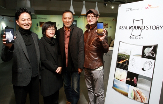 ▲ 갤럭시 라운드 전시회에 참여한 유명 작가들이 전시회 현장에 방문해 포즈를 취하고 있다. 왼쪽부터 홍성민 디자이너, 강진숙 작가, 이현세 만화가, 김도형 사진작가. /삼성전자