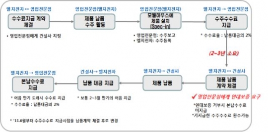 LG전자 영업전문점의 영업활동으로 자신의 빌트인 가전제품이 건설사 모델하우스에 설치되면 전체 알선수수료(납품금액의 약 4%)의 1/2을 지급하는데 이를 '수주수수료'라 하고, 건설사로부터 납품대금이 회수되면 알선수수료의 나머지 1/2을 지급하는데 이를 '본납수수료'라 한다.