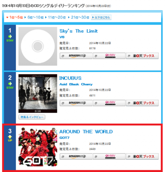 그룹 갓세븐 日 데뷔 싱글 '어라운드 더 월드' 오리콘 데일리 차트 3위./JYP 엔터테인먼트 제공