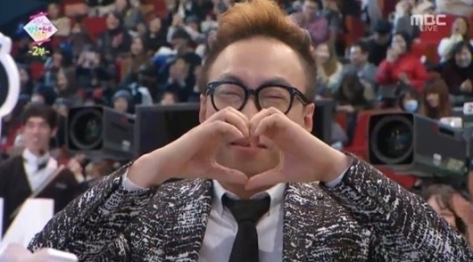 '2014 MBC 방송연예대상' 아내 한수민에게 하트를 보내는 방송인 박명수./방송캡처