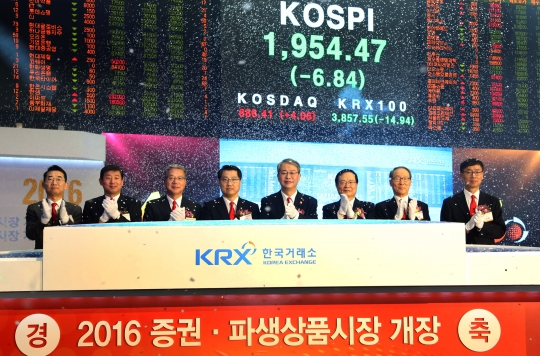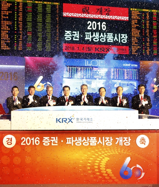 한국거래소는 4일 서울사옥 홍보관에서 금융투자업계 대표 약300여명이 참석한 가운데 2016년 증권. 파생상품시장 개장식을 개최했다. 왼쪽부터 김군호 코넥스협회장, 김준 (주)경방 대표, 황영기 금융투자협회장, 진웅섭 금융감독원장, 임종룡 금융위원회 위원장, 최경수 한국거래소 이사장, 정구용 상장회사협의회장, 신경철 코스닥협회장.
