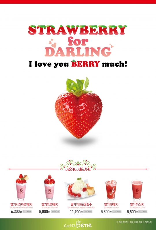 카페베네도 딸기 디저트 메뉴를 3월까지 한정 판매한다. 딸기주스, 딸기라떼, 딸기파르페, 딸기치즈파르페, 딸기 눈꽃빙수 등이 그 주인공이다.