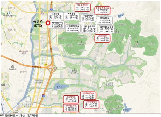 따라서, 동탄2신도시의 남부지역은 용인 남부지역과 입지적 차이가 크지 않은 반면, 동탄2신도시 프리미엄으로 분양가가 3.3m2당 1,000만원 이상에서 채택되다 보니 용인한숲시티(평균 799만원/3.3m2)과 비교했을 때 약 30% 수준의 차이가 발생하고 있다. 2015년 내내 수도권 분양은 1)좋은 입지, 2)낮은 가격이 아닌 경우 대부분 분양결과가 좋지 않았는데, 동탄2신도시 역시 차이가 없었다는 점이다. 즉, 분양단지명에서 발견할 수 있는 '입지명'이 중요한 것이 아니라, 실제 입지를 파악해볼 필요가 '매우' 크다. 같은 지역인 것 같이 보여도 전혀 다른 장소인 경우가 많다.