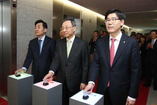 14일 서울 종로구 광화문 소재 더케이트윈타워에서 이광구 우리은행장(사진 오른쪽 부터)이 황창규 KT 회장, 윤경은 현대증권 사장과 함께 K뱅크 입주기념 현판 점등 버튼을 누르고 있다.
