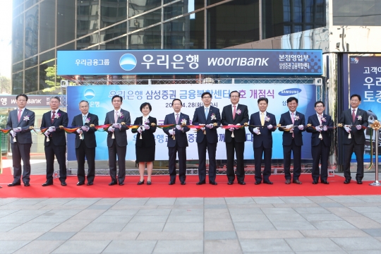지난해 4월 이광구 은행장(왼쪽 7번째)과 윤용암 삼성증권 대표(왼쪽 6번째)가 양사 임직원들과 함께 '우리은행 삼성증권 금융복합센터 1호 '개점식에서 테이프 커팅식을 하고 있는 모습./우리은행 제공
