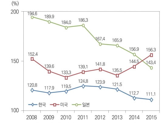 5일 자본시장연구원과 미 인구조사국(US Census Bureau), 일본 재무성에 따르면 국내 기업의 부채비율은 지난해 말 현재 111.1%이다. 지난 2008년 금융위기 때 120.8%보다 줄었다.