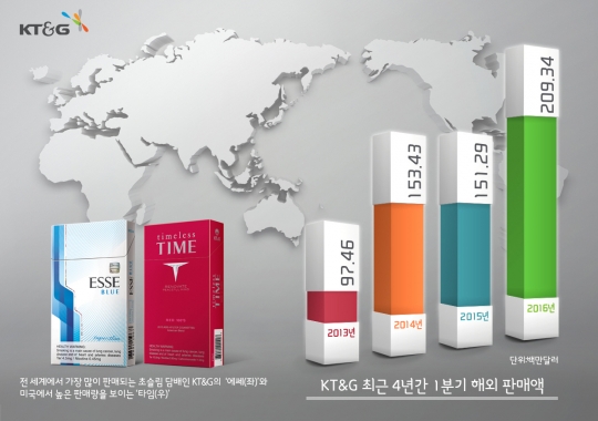 KT&G의 해외 담배 판매액은 전년 동기 대비 38% 증가한 2억 934만 달러를 기록했다. 이는 1988년 첫 수출을 개시한 이래 분기 최대치다.