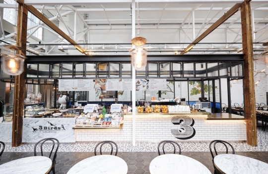 당근 줄기를 물고 있는 새는 신선&맛있는 음식 (Fresh & Tasty Foods)를 의미한다. 도심 속 사람들에게 건강한 식생활을 전하고자 메뉴는 매장에서 매일 신선하게 만들어 내는 샐러드와 샌드위치, 홈메이드 스타일의 수프, 다양한 디저트류로 구성했다. 특히 샌드위치는 가장 기본적인 에그 샐러드 샌드위치, 토마토 모짜렐라 샌드위치 같은 재료 본연의 맛을 살린 심플 쓰리버즈만의 건강한 레시피로 만든 시그니처 메뉴인 아보카도 & 쉬림프 오픈 샌드위치, 프로슈토 & 팜프레쉬 오픈 샌드위치 등도 함께 준비되어 있다. 오픈 샌드위치는 현대인들의 건강의 적인 탄수화물과 글루텐을 줄이기 위해 만든 건강한 메뉴다.
