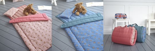 태평양물산 소프라움이 선보인 베온트레의 '다라 낮잠이불'은 부드러운 면 소재를 사용했으며, 두께감을 위해 솜을 덧대어 아이의 몸을 더욱 포근하게 감싸준다. 패드 위에 차렵이불과 베개를 접어 올린 후 패드에 달린 끈으로 묶으면 가방처럼 들 수 있다.