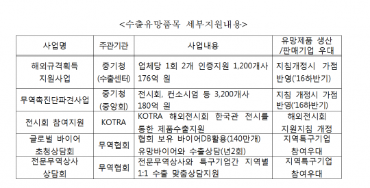 수출 유망품목 30개는 현재 수출액이 2억 원 이상이면서 1개국에만 수출되고 있는 품목으로 유망수준에 맞는 '수출고도화사업' 등 5개 사업 우대지원을 통해 수출국을 다변화한다.