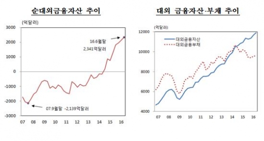 우리나라의 순대외금융자산은 분기 기준 지난 2014년 9월 말 처음 플러스를 기록한 이후 대외금융자산이 대외금융부채를 초과하는 순자산국 지위를 유지하고 있다.