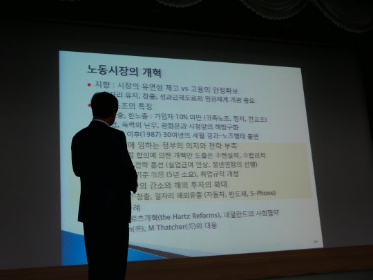 윤증현 전 기획재정부 장관이 지난 11월29일 서울 역삼동 한국과학기술회관에서 열린 '휴넷골드명사초청특강'에서 강연을 하면서 노동시장 개혁에 관해 프리젠테이션을 보면서 말을 하고 있다. /김승호