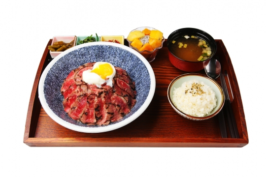 고슬고슬한 밥 위에 먹기 좋게 한입 크기로 썰어진 소고기 등심 스테이크가 마치 꽃잎처럼 데미그라스소스와 함께 덮여져 나온다. 미디엄으로 구워진 고기 꼭대기에는 수란이 올라가 있다.