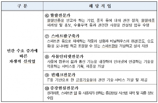 해외사례 비교·분석 및 관계부처 의견수렴을 거쳐 선정된 신직업은 '정부 육성·지원 신직업' 5개와 '민간 자생적 창출 신직업' 5개로 구성됐다.