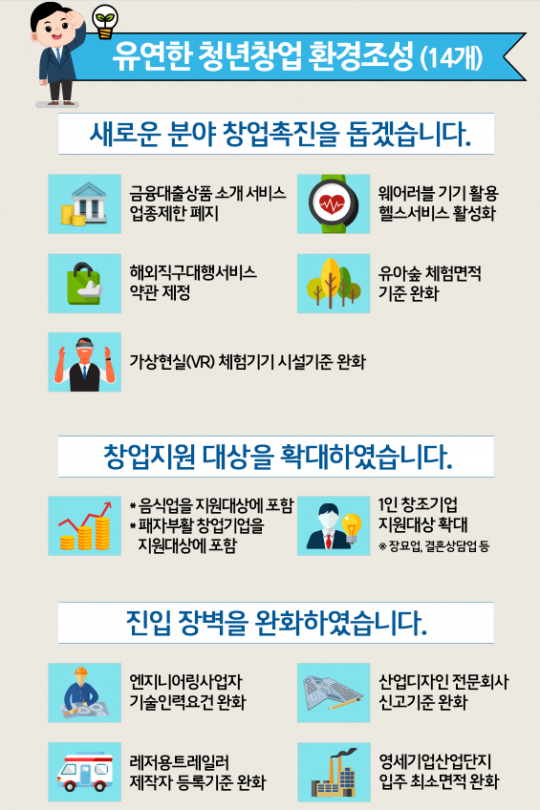 정부는 동물장묘업, 결혼상담업, 세탁업 등도 '1인 창조기업법'의 지원을 받아 창업을 손쉽게 할 수 있도록 했다. 그동안 이들 업종은 1인 창조기업 비즈니스센터나 1인 창조기업 사업화지원 등에 참여할 수 없었다. 국민들의 수요가 많고, 유망서비스업으로 꼽히고 있는 동물장묘업 등도 정부 지원을 받아 창업을 할 수 있도록 유도한 것이다.