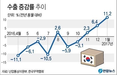 연간 기준으로 2015∼2016년 2년 연속 하락했던 수출이 지난해 11월을 기점으로 회복하는 모습을 보이면서 수출에 대한 기대감도 커지고 있다.