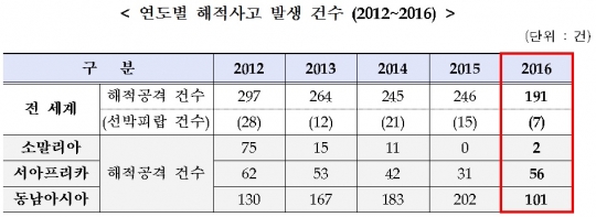 2015년의 246건과 비교하면 22.4% 감소한 수준으로 말라카·싱가포르 해협, 인도네시아 등 동남아 해역에서 발생한 해적사고는 101건으로 2015년의 절반으로 줄었다.