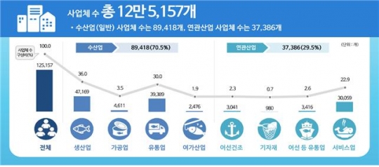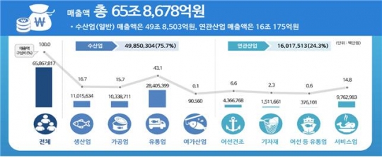 이 중 일반 수산업 매출액은 49조9000억원(75.7%), 연관산업 매출액은 16조원(24.3%)으로 조사됐다.