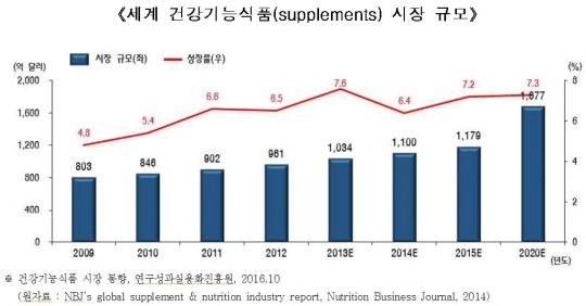 2015년 기준, 세계 건강기능식품 시장규모는 1179억 달러로 추정되며 연평균 7.3% 성장해 2020년에는 1677억 달러에 이를 것으로 전망된다.