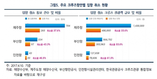 KMI가 발표한 동향 분석 보고서 '국내 크루즈시장 체질개선 시급'에 의하면 국내 크루즈시장에서 중국인 관광객은 92.2%를 차지하며 단체관광객 의존도가 매우 높아 중국의 여행제한조치에 의해 2017년 국내 크루즈 입항이 목표치 대비 39.3%가량 취소되는 등 피해가 큰 실정이다.