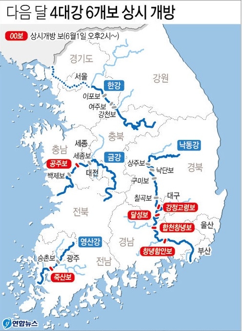 이날 정부는 가뭄 극복 대책과 함께 지난 22일 "하절기 이전에 4대강 녹조발생이 심하고 체류시간이 길며 수자원 이용에 영향이 없는 보를 즉시 개방토록 한다"는 청와대 발표 후속조치로 6월 1일부터 4대강 16개 대형보 중 6개에 대해 우선 상시개방을 추진한다고 밝혔다.