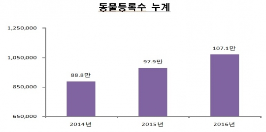11일 농림축산식품부가 발표한 '동물의 보호와 복지관리 실태 조사'에 따르면 지난해 말 기준 동물등록제에 등록된 동물 수는 총 107만700마리인 것으로 나타났다.