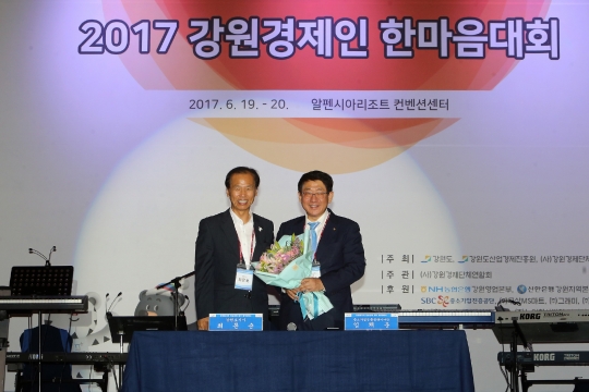 19일 강원도 평창 알펜시아리조트에서 열린 중소기업진흥공단과 강원도간 '강원일자리 인심공제 협약식'에서 최문순 강원도지사와 임채운 중진공 이사장(왼쪽부터)이 기념촬영을 하고 있다. /중진공