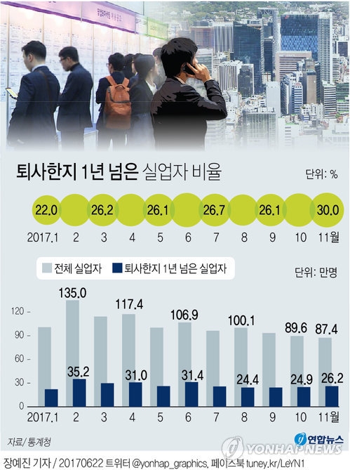 최근 청년 실업률이 9%를 넘기며 사상 최고치를 기록한 가운데 회사를 퇴직한 후 1년이 넘도록 새 직장을 찾지 못한 실업자 비율 또한 역대 최고를 기록한 것이다.