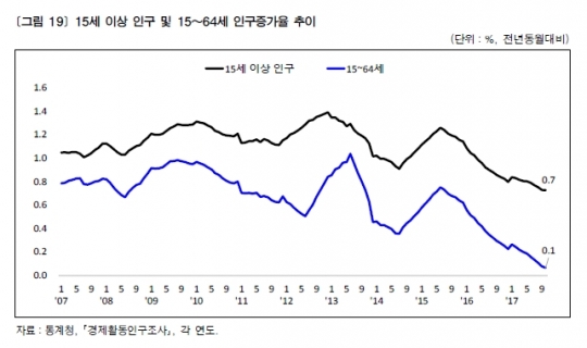 저출산·고령화 영향으로 15세~64세 인구증가율이 빠르게 둔화되고 있으며 내년부터는 감소로 전환될 가능성이 높아 취업자 수 증가폭이 올해보다 커지기는 어려운 인구 변동 상황에 직면하기 때문이다.