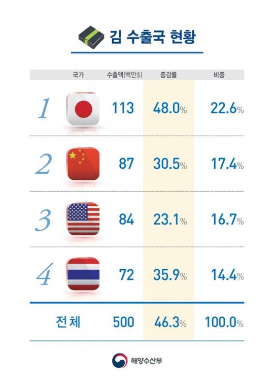 이에 따라 지난 2007년 6000만 달러에 불과하던 김 수출액은 2010년 1억 달러를 달성한 이후 연이어 2억 달러와 3억 달러를 빠른 속도로 돌파했으며, 올해 5억 달러까지 달성하며 우리나라 대표 수출식품으로 부상했다.