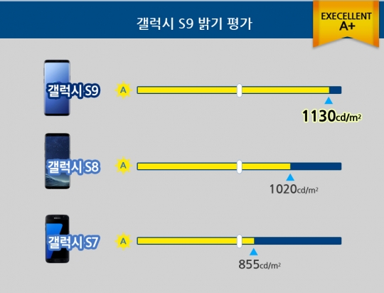 갤럭시S9은 최대 밝기와 반사율도 개선됐다. 갤럭시S9의 최대 밝기는 1130cd/㎡(칸델라)로 갤럭시S8의 1020cd/㎡보다 10.7% 더 밝아졌다. 1130cd/㎡는 가로세로 1미터의 상자에 촛불 1130개를 동시에 켜 놓은 밝기를 뜻한다. 화면 반사율도 4.4%로 낮아져 역대 최저치를 기록, 야외 시인성 개선에 기여했다.
