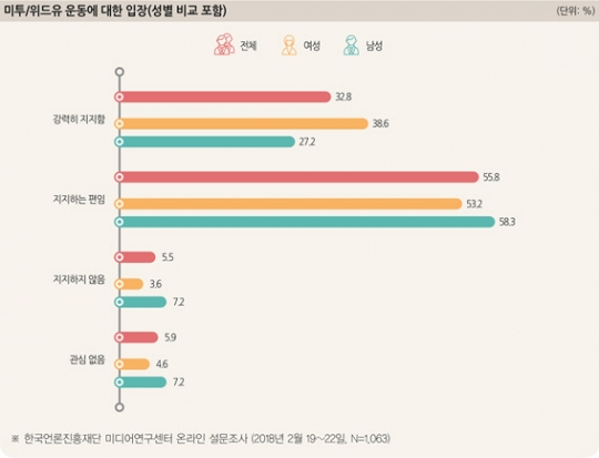 미투 운동에 대한 국민 인식 조사 결과 응답자의 88.6%(강력히 지지함 32.8%, 지지하는 편임 55.8%)가 미투 운동을 지지하는 것으로 나타났다./ 한국언론진흥재단