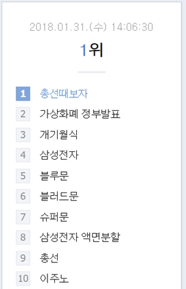 같은 달 31일에는 네이버 비트코인 카페에서 한 회원의 주동 하에 정부의 가상화폐 규제 정책에 항의하는 뜻으로 "총선때보자"를 실시간 검색어 1위에 올려놓기도 했다.