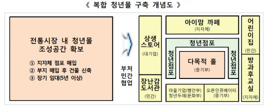 쇼핑과 육아 등이 집약된 '복합 청년몰'도 올해안에 전국적으로 10곳을 새로 조성한다. 지자체가 시장내에 비어있는 점포를 매입하거나 땅을 사 건물을 지어 임대하는 방식 등을 통해서다.