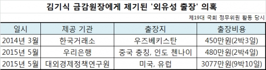 김 원장은 ▲2014년 한국거래소 부담으로 2박 3일 우즈베키스탄 출장 ▲2015년 우리은행 예산으로 2박 4일간 중국 충칭, 인도 첸나이 방문 ▲2015년 대외경제정책연구원 돈으로 9박 10일간 미국, 유럽으로 출장을 다녀왔다는 의혹을 받고 있다.