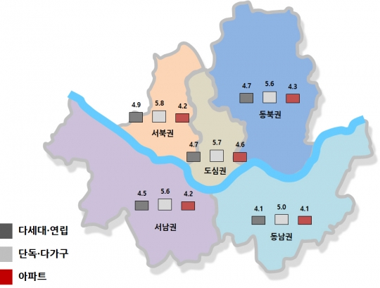 2018년 1분기 권역별·주택유형별 전월세전환율./ 서울시