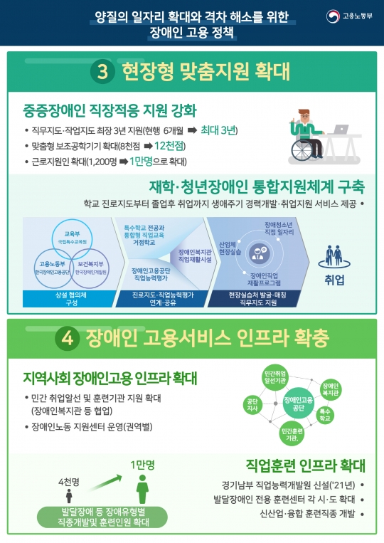 또한, 최근 최저임금 인상으로 인한 장애인 고용부담을 줄이기 위해 장애인 고용장려금을 인상하고 중증·여성·장년·청년(발달) 등 특히 취약한 장애인을 대상으로 한 맞춤형 취업 지원도 확대된다.