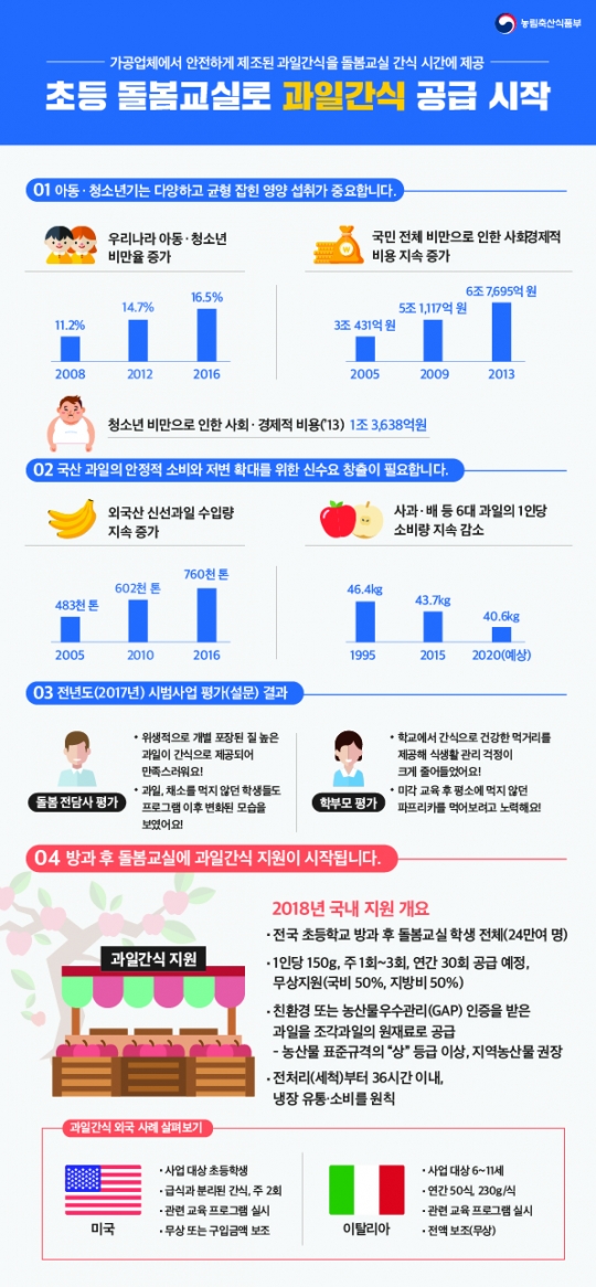 올해 처음 시작된 초등학교 방과 후 돌봄교실 대상 과일간식 지원사업은 아동비만으로 인한 사회경제적 비용을 줄이고, 국내산 과일 소비도 늘리기 위해 시작됐다.