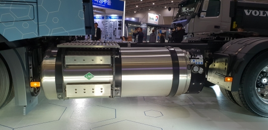 LNG 가스를 동력으로 하는 볼보 FH LNG트럭의 연료탱크/정연우 기자