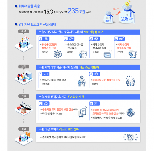 또 수출기업의 원활한 자금흐름을 돕기 위해 수출단계(계약-제작-선적-결제)별로 총 35조7000억원 규모의 8개 무역금융 지원 프로그램도 신설하거나 확대한다.