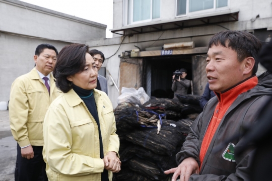 박영선 중소벤처기업부 장관이 9일 강원지역 산불 피해기업을 방문, 관계자로부터 이야기를 듣고 있다./중기부