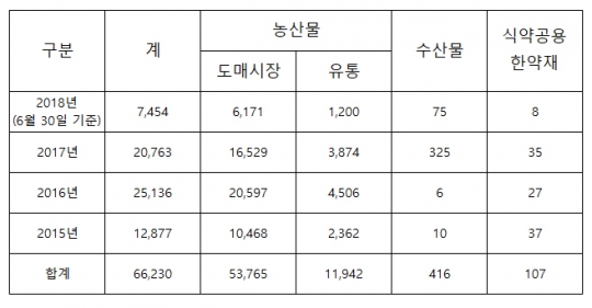 시가 지난 2015년부터 2018년 6월까지 폐기처분 한 농수산물은 총 66.23t이다. 도매시장 농산물이 5만3765kg로 가장 많았고 유통점 농산물 1만1942kg, 수산물 416kg, 식약공용 한약재 107kg 순이었다.
