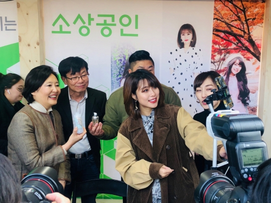 박영선 중소벤처기업부 장관(맨 왼쪽)과 김상조 청와대 정책실장(왼쪽 두번째)이 9일 서울 서대문구 연세로에서 열린 '가치삽시다! 소상공인 한마당'에 마련된 중국 왕홍 채널 시청자들에게 한국 제품을 소개하고 있다./사진=배한님 기자