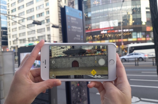 돈의문 터에 도착해 앱스토어에서 미리 내려받은 '돈의문AR' 애플리케이션을 실행시켰다. 스마트폰 카메라 렌즈를 정동사거리쪽으로 돌렸더니 화면에 '돈의문을 복원 중입니다. 움직이지 말아주세요'라는 문구가 떴다. 약 20초 후에 돈의문이 나타났다. 견고하게 쌓은 돌축대 한 가운데 무지개 모양으로 반쯤 둥글게 만들어진 홍예문이 나 있었다. 축대 위엔 우진각(정면에서 보면 사다리꼴, 측면에서는 삼각형 모양) 지붕의 초루가 세워졌고 낮은 담으로 둘러싸여 있었다. 국보 1호 숭례문과 비슷한 모습이었다.