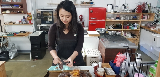 흥흥발전소에서 체험 공방 및 까페를 운영하고 있는 앙두 이지은 대표(36)가 수제쿠키를 포장하고 있다.