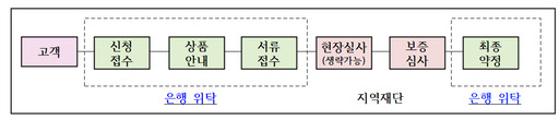 보증 상담 및 서류 교부→신청서류 접수→신용 조사→ 보증심사·승인통지→신용보증약정체결, 전자보증서발급 단계 중 지역신보가 보증심사·승인통지만 담당하고 나머 입무는 은행이 처리하면서 업무 효율화가 이뤄진 까닭이다.