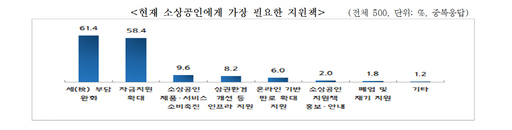 또 현재 소상공인을 위해 가장 필요한 지원책으론 '세금 부담 완화'(61.4%), '자금 지원 확대'(58.4%) 등을 꼽았다.