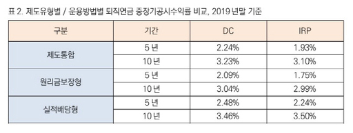 미래에셋대우의 퇴직연금 중장기공시수익률 비교 자료에서도 퇴직연금 DC와 IRP의 수익률은 원리금보장형 상품보다는 실적배당형 상품의 수익률이 높은 것으로 조사됐다. DC 와 IRP의 10년 수익률은 각각 연 3.23%, 연 3.1%로 5년 수익률 연 2.24%, 연 1.93%보다 높아 장기로 갈수록 수익률이 높았다.