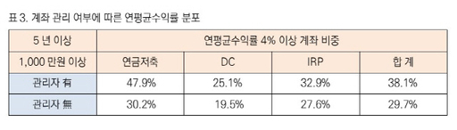 또한 연금자산을 관리함에 있어 직원을 통해 컨설팅을 받는 계좌와 고객 스스로 알아서 관리하는 계좌의 운용성과를 비교한 결과, 관리직원이 있는 경우의 수익률이 높게 나타났다.